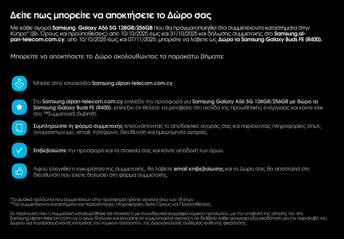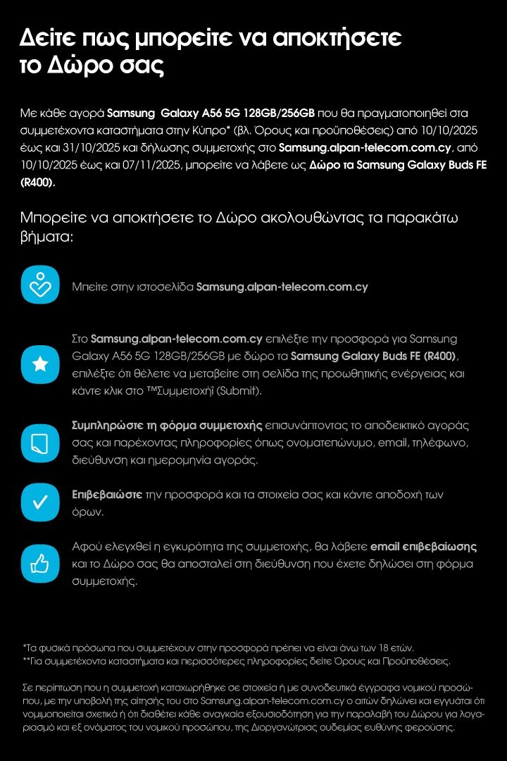 Το cookie είναι ένα μικρό ηλεκτρονικό αρχείο, συνήθως αποτελούμενο από γράμματα και αριθμούς, το οποίο αποστέλλεται από μια διαδικτυακή τοποθεσία και αποθηκεύεται στην ηλεκτρονική συσκευή του χρήστη, επιτρέποντας την ταυτοποίηση της συγκεκριμένης συσκευής. Τα Cookies παίζουν πολύ σημαντικό ρόλο στην εν γένει λειτουργία του διαδικτύου καθώς συμβάλουν στην βελτιστοποίηση της εμπειρίας πλοήγησης του χρήστη στο Διαδίκτυο. Στο Samsung.alpan-telecom.com.cy χρησιμοποιούμε Cookies για να βελτιώσουμε την εμπειρία σας κατά τη χρήση της ιστοσελίδας μας όπως επίσης για να διατηρούν πληροφορίες οι οποίες χρησιμοποιούνται για την ανάγκη στατιστικών μελετών και αποθηκεύουν τα αγαπημένα σας προϊόντα για συγκεκριμένο διάστημα. Απενεργοποιώντας τα Cookies ή κάνοντας ανάκληση της συγκατάθεσης σας, συγκεκριμένες λειτουργίες της ιστοσελίδας πιθανον να μην ειναι διαθέσιμες.